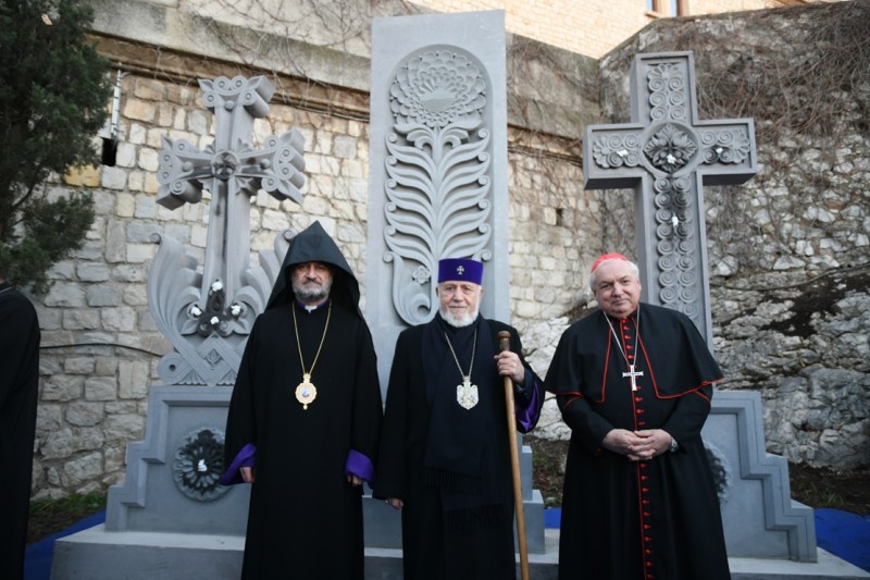 Pour la première fois, deux croix Khatchkars (traduction : Croix en pierre), la Croix Arménienne "arbre de la vie" et la Croix Latine sont côte à côte, sculptées dans la même pierre volcanique arménienne.
